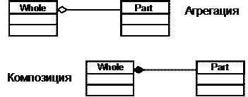 Соединения, являющиеся экземплярами композиций или агрегаций также изображаются с ромбами на полюсах.