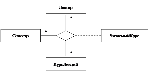 К N-арным ассоциациям могут быть присоединены классы ассоциаций. Классы Лектор, Семестр и КурсЛекций связаны тернарной ассоциацией (означающей, что некоторый лектор читает курс лекций в определенном семестре). Класс ассоциаций ЧитаемыйКурс может хранить дополнительные сведения о связи, например, количество слушателей и т. п.
