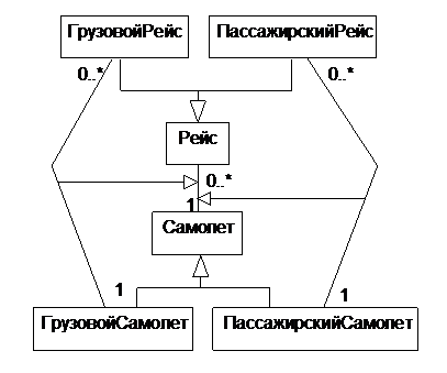 Обобщение рассматривается не только для классов, но и для ассоциаций. В этом случае стрелка обобщения соединяет две ассоциации. Заметим, что в моделях такое встречается редко. Ниже приведен пример, когда ассоциация между рейсом и самолетом переопределяется в классах наследниках ассоциациями-наследницами.